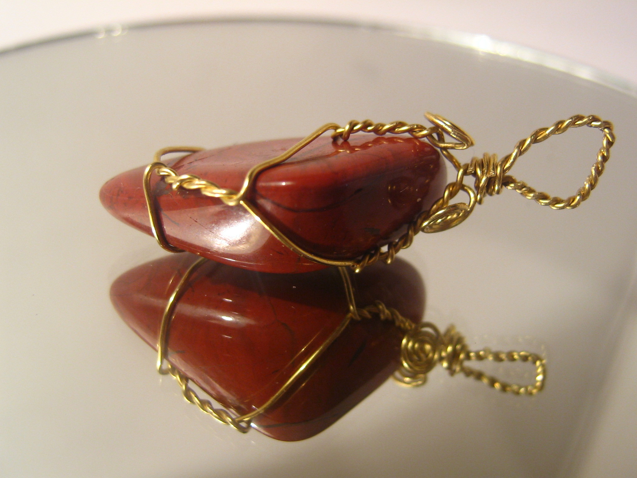A beautiful Red Jasper stone encased in gold wire ready for your favorite chain.